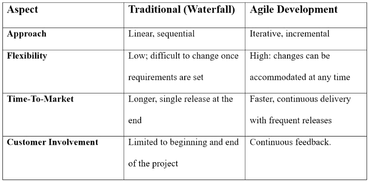 Traditional (Waterfall) development follows a strict-step-by-step process where each phase must be completed before moving to the next. Any modifications to the software typically need to be formally approved, further causing delays. Testing the software for fixes and modifications only occurs at the end, making it harder to detect and fix issues early. Contrastingly, Agile development provides for high flexibility and cross functional collaboration across teams, all while helping you and your team stay ahead of the competition.